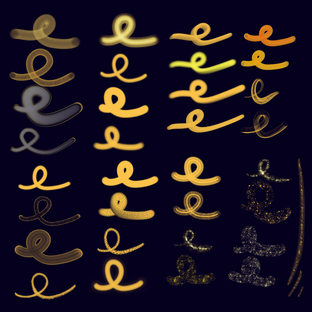 More than 35 unique brushes to create awesome effects, 3D looking, bevel, and glitter.