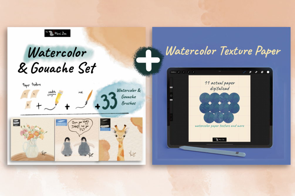 Watercolor + Paper$10 $6$10 $6https://schema.org/InStockusdby Mari Zenby Mari ZenThis bundle contains...Watercolor and Gouache Brush Set + sketch crayon + ink + 3 paper textures for Procreate0.0 (0)Qty: 1$8Procreate Watercolour Paper Texture 11 brushes5.0 (1)Qty: 1$2Add to cartWatercolor + Gouache + Paper textureAdd to wishlist New wishlistShareShare on XShare on Facebook Copy linkCopy product URL