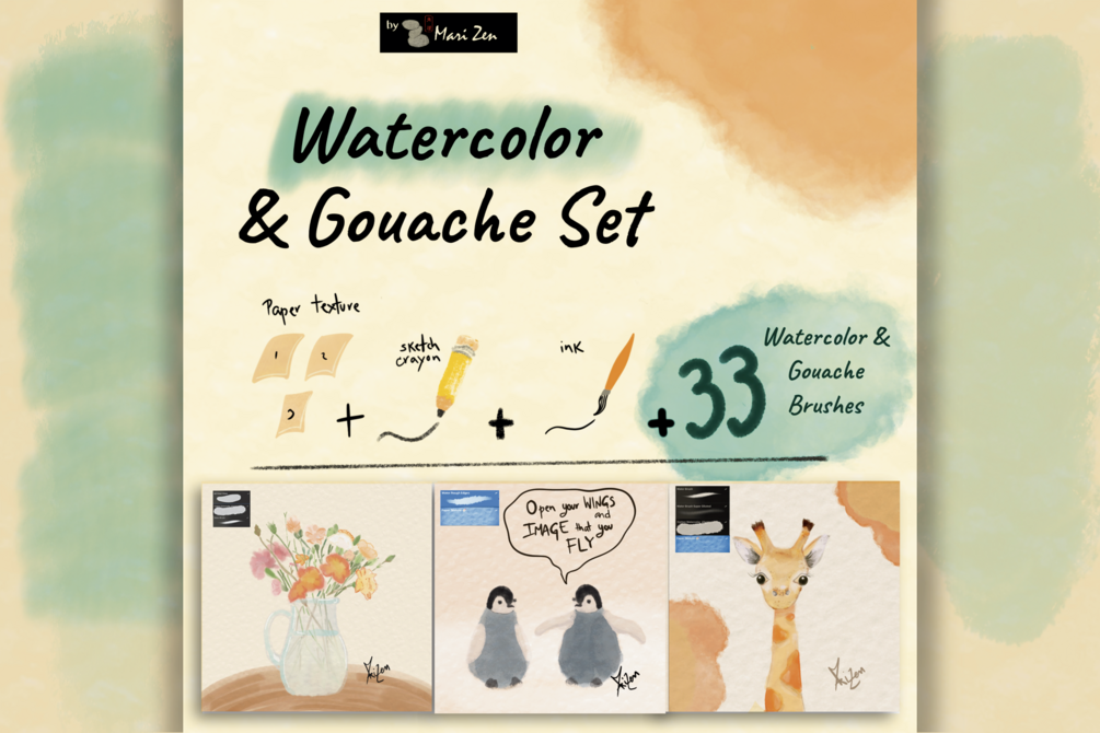 Watercolor and Gouache Brush Set + sketch crayon + ink + 3 paper textures for Procreate